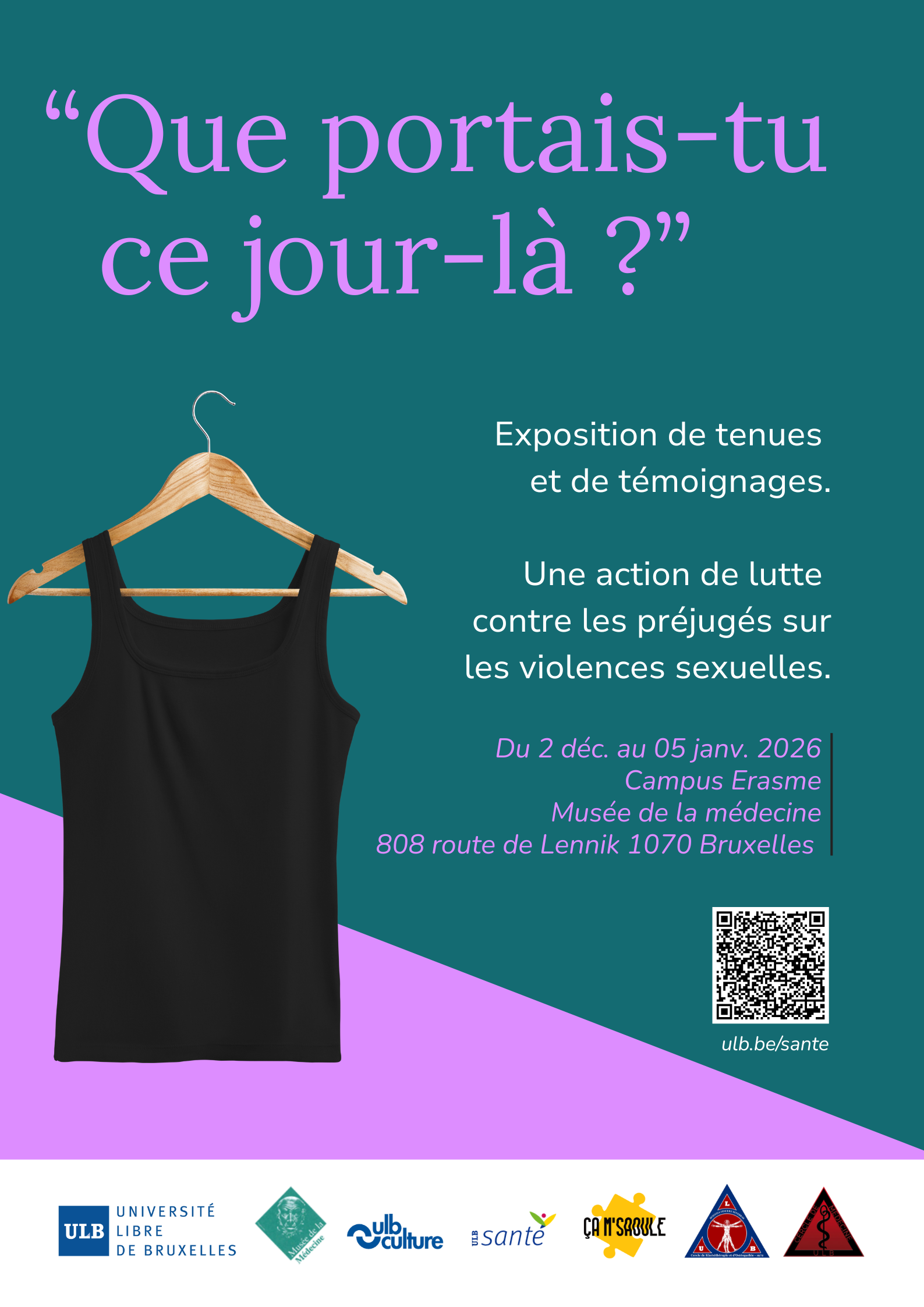 ULB Santé, ULB Culture, le Musée de la médecine et les cercles étudiants de kinésithérapie et ostéopathie (CKO) ainsi que le cercle de médecine (CM) vous invitent du 02 décembre au 05 janvier 2026 à la découverte de l'exposition "Que portais-tu ce jour-là ?"